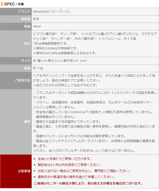 babybuba(ベビーブーバ)のボディ&マッサージオイルは、フランスのオーガニック認証ECOCERT(エコサート)オーガニックコスメティックを取得している、生後1ヶ月頃からご使用可能なオーガニックオイル。